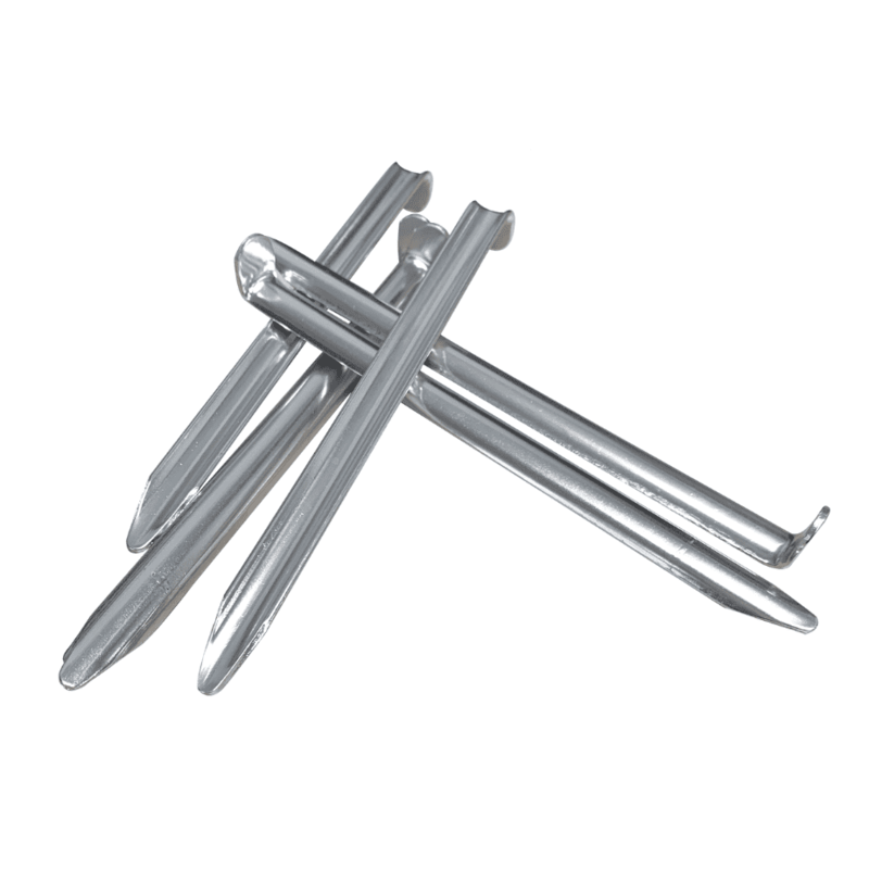 A solid aluminum tent peg, whose V-shape lends itself to staking down tents, tarps, and shelters in firmly-packed earth