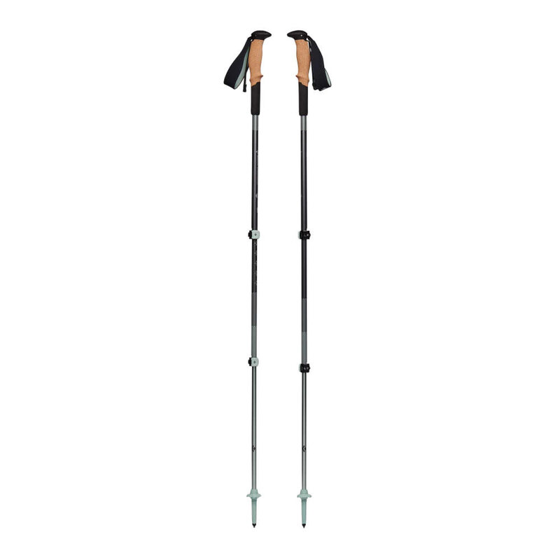 These high-end, three-piece aluminum trekking poles represent significant innovation in hiking gear. The Pursuit Shock technology hidden within the grip dampens vibrations to reduce on-trail joint pain. The natural cork grips manage moisture, and the Bloom foam grip extensions provide additional versatility. The proprietary grip geometry comes in two sizes, and allows for a greater degree of comfort. The FlickLock+ allows for easy on-the-go length adjustments, and the Solution 2.0 wrist straps are made from sustainable materials. And if all of that wasn’t enough, there’s a 1.5-mm hex bit tool built into the shaft, for maintenance in the field.