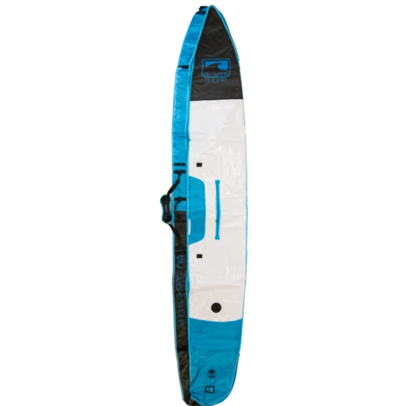 Redesigned for 2021, this board bag incorporates a variety of material and feature upgrades. Now constructed with a combination of high quality hex pattern 1680D polyester and heavy duty tarpaulin, with 7mm of foam padding, non-corrosive YKK zippers, fin slots and heavy duty buckles. The full zip coffin style allows you to fully open the bag and place your board inside for easy packing and unpacking, and synch straps on the sidewalls ensure a perfect fit. Heavy duty handles at the nose, tail, and rails provide multiple options for solo or tandem carrying, as does the unique zip opening at the center of the ag to access the board's handle. Additional upgrades include air vents, padded shoulder strap, address card slot and an integrated paddle holder.