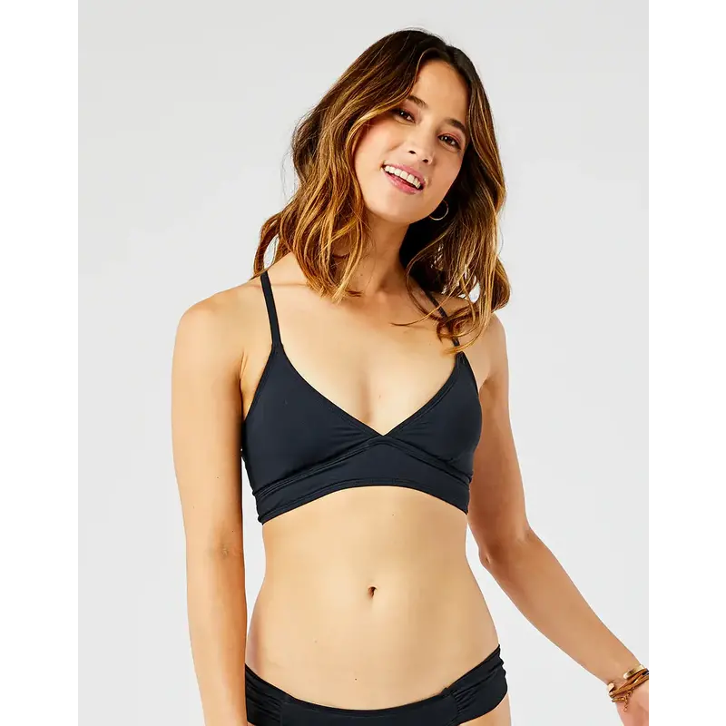 This women’s swimsuit top, made from recycled plastic bottles, is stylish and fashion-forward, while the thicker chest band provides support. The halter top with twisted back is adjustable and supportive to all sizes.