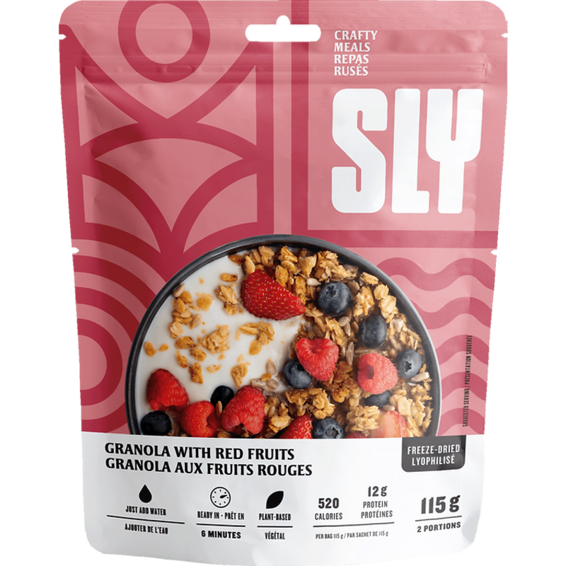 Start your day right on the trail with Sly Foods Red Fruit Granola, a gluten-free breakfast that transforms from lightweight pack food to a satisfying meal with just 150ml of warm water. This camping-friendly granola combines hearty gluten-free oat flakes with a vibrant quartet of freeze-dried berries – strawberry, raspberry, blackberry, and blueberry – delivering 520 calories and 12g of protein to fuel your outdoor adventures. The ingenious dual tear notch packaging lets you prepare and eat directly from the bag, making it perfect for backpacking trips where every gram counts and dishwashing isn't an option. With an integrated oxygen absorber ensuring long-term freshness, this ready-to-eat breakfast solution is as reliable in your emergency food stash as it is satisfying after a morning summit push.