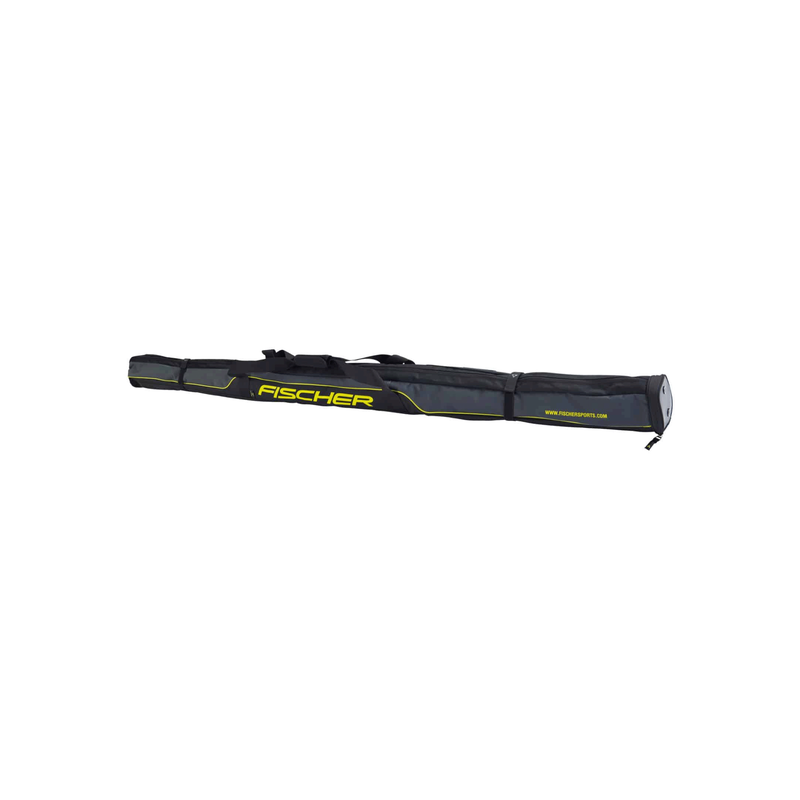 Nordic ski carry bag with handle straps for one pair of skis is 195cm long and can be extended to 210cm. Double zipper and compression straps keep things secure with easy access when needed. Made of recycled PET fabric