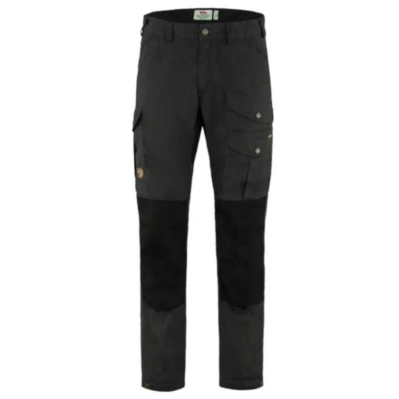 Durable trekking trousers for adventures in the mountains and forest. Made from durable wind and water-resistant G-1000 fabric with double layers over the rear and knees. Regular waist (mid waist) and regular fit with pre-shaped knees. Six practical pockets including a map pocket and a multitool pocket. Elastic strap adjustments with press buttons on leg endings. Available in three lengths; short, regular and long.