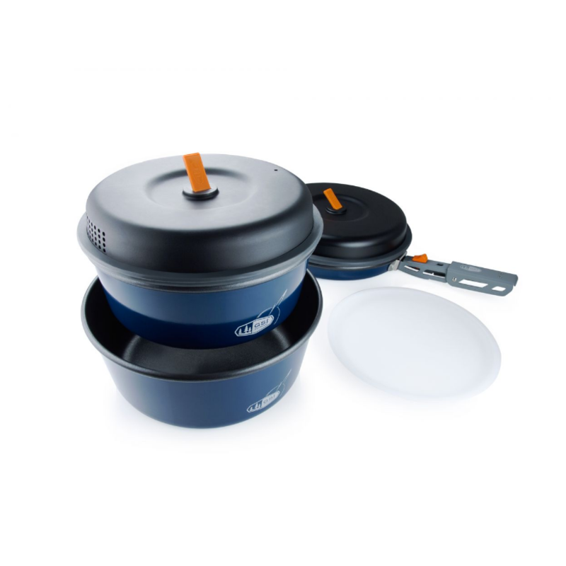 The Bugaboo Base Camper offers premium performance at an exceptional value. The pot and lid combo are perfect for stovetop use. Every set includes a 2 pots, a frypan, 2 nylon strainer lids, a dished cutting board for a variety of prep duties, a folding pot handle, and a welded stuff sack to keep everything organized and doubles as a sink for washing.