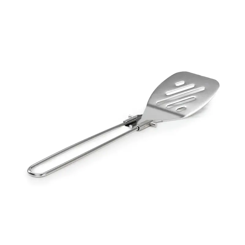 The flat front of the spatula serves dual duty as an efficient scraper and great egg flipper. The dual position handle folds over for compact storage, or open into a large bladed spatula.