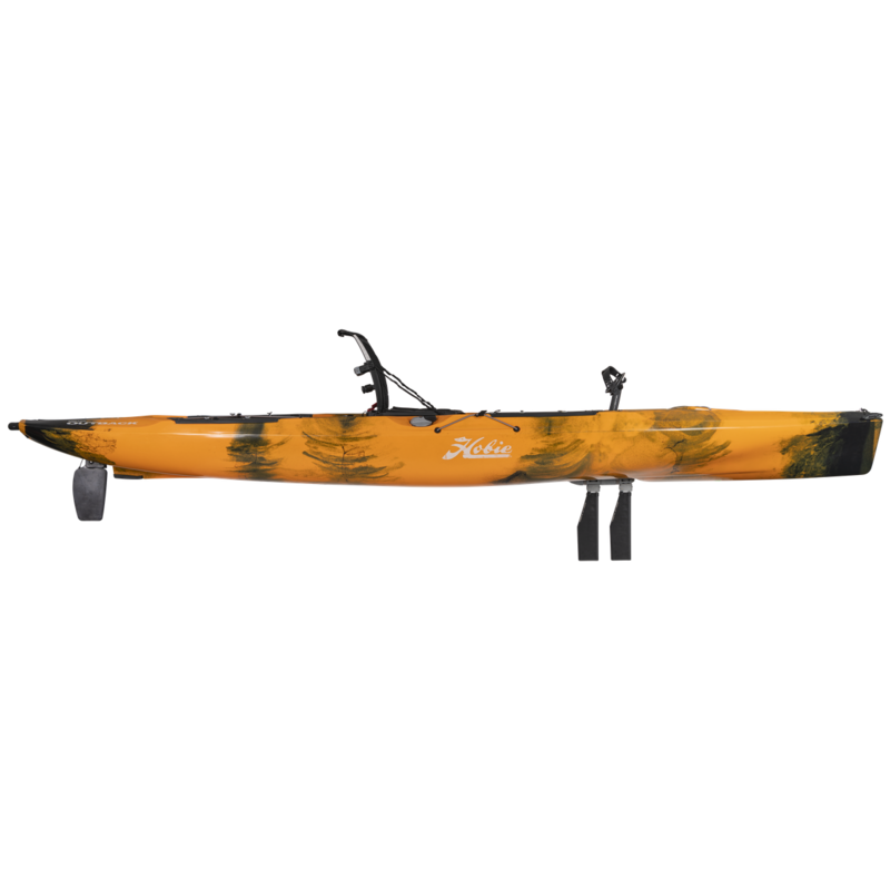 This fully-loaded fishing machine is built for every conceivable fishing expedition, whether you’re prowling the ocean for monster gamefish or stalking bass in your favorite freshwater fishing hole. Hobie has advanced the sport of kayak fishing with Kick-Up Fins that automatically retract upon impact. The extra-wide standing deck offers an improved casting platform and convenient vantage point for sight fishing, allowing for superior vision from above while the revolutionary Guardian Transducer Shield gives you multidimensional vision below. The adjustable Vantage CTW seat provides 1.5" of extra width and lumbar support for unmatched room and comfort for long days on the water. The Hobie H-Rail with integrated patented RAM® Hand-Track™ and numerous high-capacity storage compartments deliver the ultimate customization and organization in accessory mounting, ensuring that all of your gear is at your fingertips. Powered by the MirageDrive 180 with Kick-Up Turbo Fins, this fine-tuned angling vessel is highly versatile, fast, quiet, and exceedingly nimble. Featuring Hobie's Kick-Up Rudder system with dual steering capabilities, combating drift and navigating tight water has never been easier.