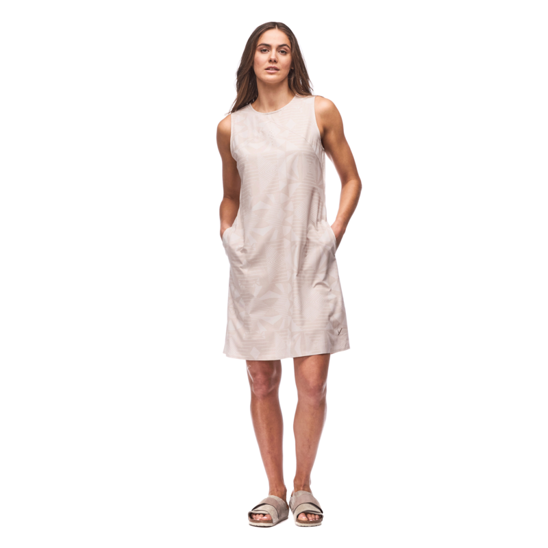 The knee length sleeveless dress Lieve is made of a light woven fabric that offers comfort, lightness, softness and stretchability. The fabric dries quickly and has moisture wicking properties. These features make this dress versatile, great for hiking, travel and various outdoor activities. Made from GRS-certified recycled polyester.