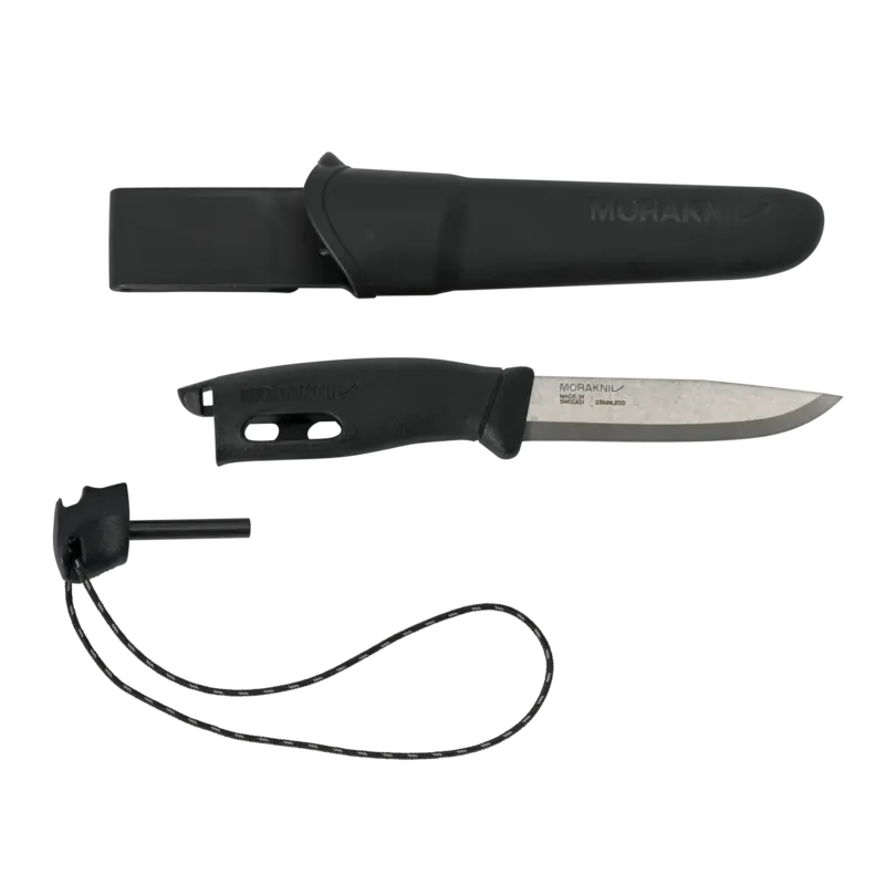 This is an outdoor knife with an integrated fire starter. The ergonomic barrel-shaped polymer handle features a soft friction grip, a finger guard, and a 3.2 mm thick blade made of recycled Swedish stainless steel.