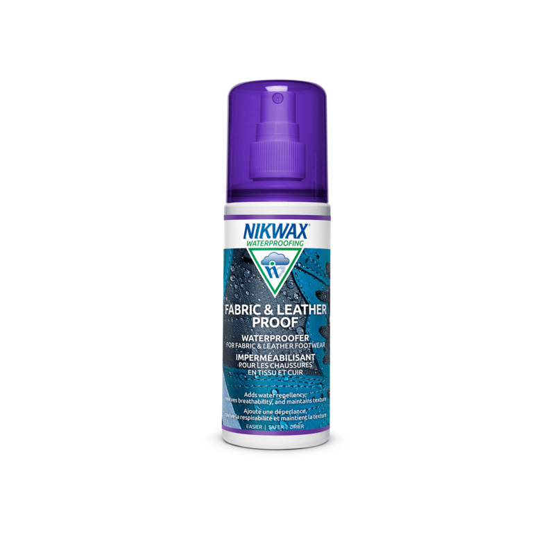 Nikwax Fabric & Leather Proof is easy and quick to apply: just spray on to wet boots. Nikwax Fabric & Leather Proof provides highly-durable water repellency (DWR), which develops on air drying. It leaves a flexible water repellent treatment on individual fibers of fabric and leather. This allows moisture vapor to pass through, maintaining breathability, and keeping your feet dry. Nikwax Fabric & Leather Proof has been specifically designed and optimized for fabric and leather combination footwear.