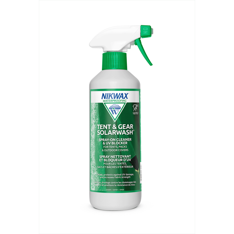 Synthetic fabrics used for tents and backpacks are coated with a water-repellent treatment. Exposure to ultraviolet (UV) light both destroys the water-repellency, and leads to a reduction in fabric tear-strength, significantly shortening the lifespan of equipment. Applying Nikwax Tent & Gear SolarWash can double the effective life of equipment, by cleaning and protecting against UV damage, while also revitalizing Durable Water Repellency (DWR) to keep the rain out. Tent and backpack fabrics are light and strong, but vulnerable: tents and backpacks use synthetic fabrics, such as nylon or polyester, with a thin, watertight polyurethane (PU) or elastomeric coating on the inside, and a DWR coating on the outside. This combination gives great strength and water-resistance, combined with light weight - ideal attributes for outdoor equipment. Unfortunately, these fabrics are vulnerable to sunlight, and in two weeks of continuous exposure, can lose up to half of their strength. Additionally, the inner coating will degrade if it is left damp for long periods. Nikwax Tent & Gear SolarWash is specifically formulated to clean effectively, revive DWR, and add UV protection to all weatherproof textiles, including cotton, canvas, and all synthetic fabrics.