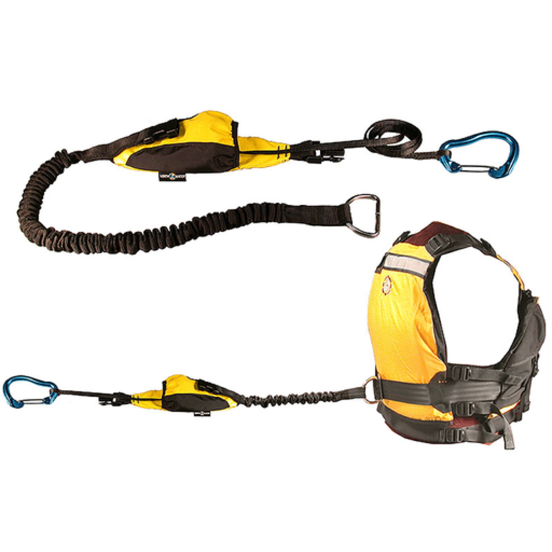 This compact system gives you the option of turning a short 4.5 foot tow line immediatly into a 15 foot tow line with the release of a buckle. It attaches to any quick-release PFD harness, has built-in floatation and shock absorber. It gives you the versatility you need for a quick rescue.