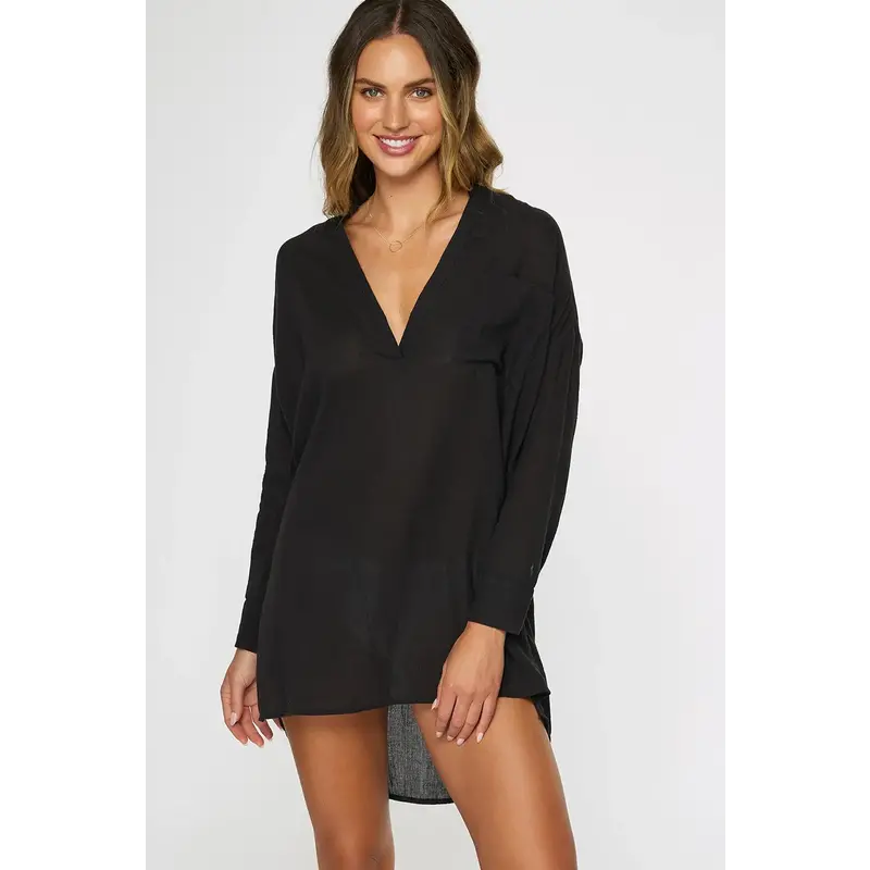 A flowy cover-up to elevate your beach look. It has a long sleeve design, saddle cut hem and v-neckline.