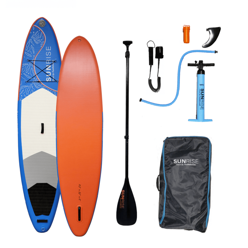 The middle size in the Sunrise Inflatable SUP line-up, the 11'2"x32" Cayman Brac is a great all-round board. Stable and maneuverable, yet still quick to glide through the water, this board is perfect for cottages and families where kids will play on the board in the morning, and you'll paddle across the lake in the afternoon.
