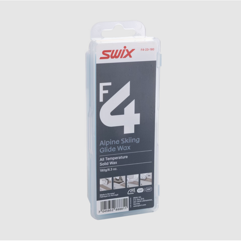 Keep your skis and snowboard gliding smoothly all season long with Swix F4 Universal Glide Wax, the one-wax solution that eliminates the guesswork from winter sports maintenance. This versatile 180g block works across all temperature ranges and snow conditions, making it perfect for recreational skiers and snowboarders who want reliable performance without the hassle of managing multiple temperature-specific waxes. Simply iron it on at 130°C, scrape, and brush for a professional-grade finish that delivers consistent glide whether you're carving groomers on a bluebird day or navigating variable spring conditions. With enough wax for multiple applications throughout the winter, the F4 lets you spend more time on the mountain and less time in the tune shop.