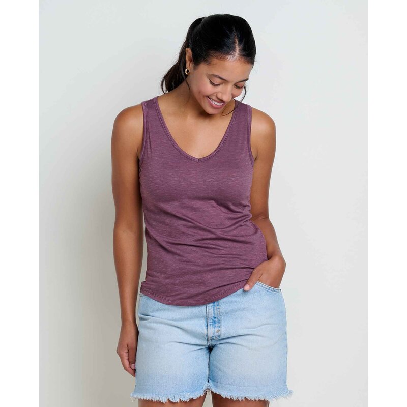 Pack light and stay fresh with the Toad & Co. Marley Tank Top, your new go-to travel companion that thrives when laundry facilities are nowhere to be found. This women's v-neck tank combines organic cotton with TENCEL™ Lyocell in their signature Samba Dia fabric blend, creating a naturally breathable and odor-resistant top that keeps you comfortable from sunrise hikes to evening dinners. The thoughtful bra-friendly strap design means no awkward reveals, while the stretchy, soft fabric holds its shape trip after trip, making it perfect for multi-day adventures or extended travel where every piece in your pack needs to work overtime. Whether you're island hopping or backpacking through the mountains, this sustainable tank top proves that eco-friendly clothing doesn't mean compromising on performance.