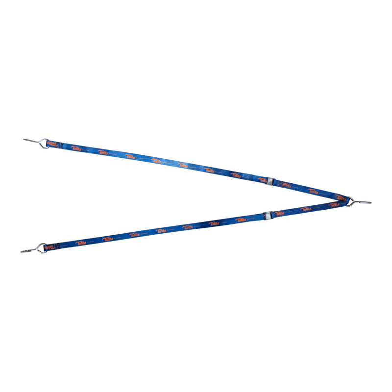The center hook attaches to the bow or stern, and the 2 end hooks go to the mounting points on the vehicle. Two of these straps are needed: one for the front and one for the back.